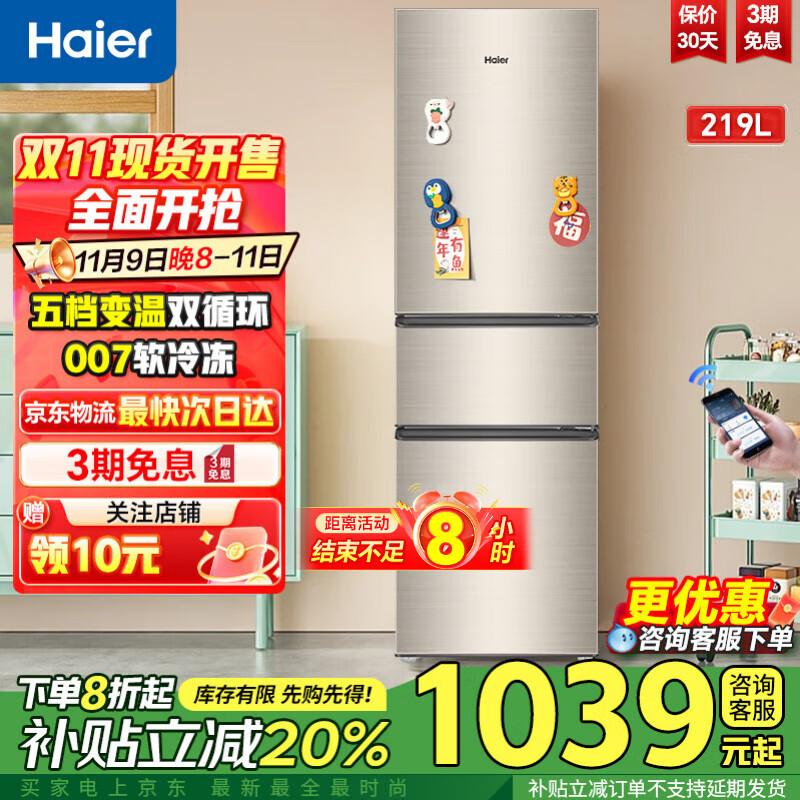 包邮 海尔冰箱219升三开门冰箱小型家用电器宿舍租房小冰箱多温区保鲜冷冻节能低噪超薄国家补贴以旧换新 219升三门直冷节能丨007软冷冻